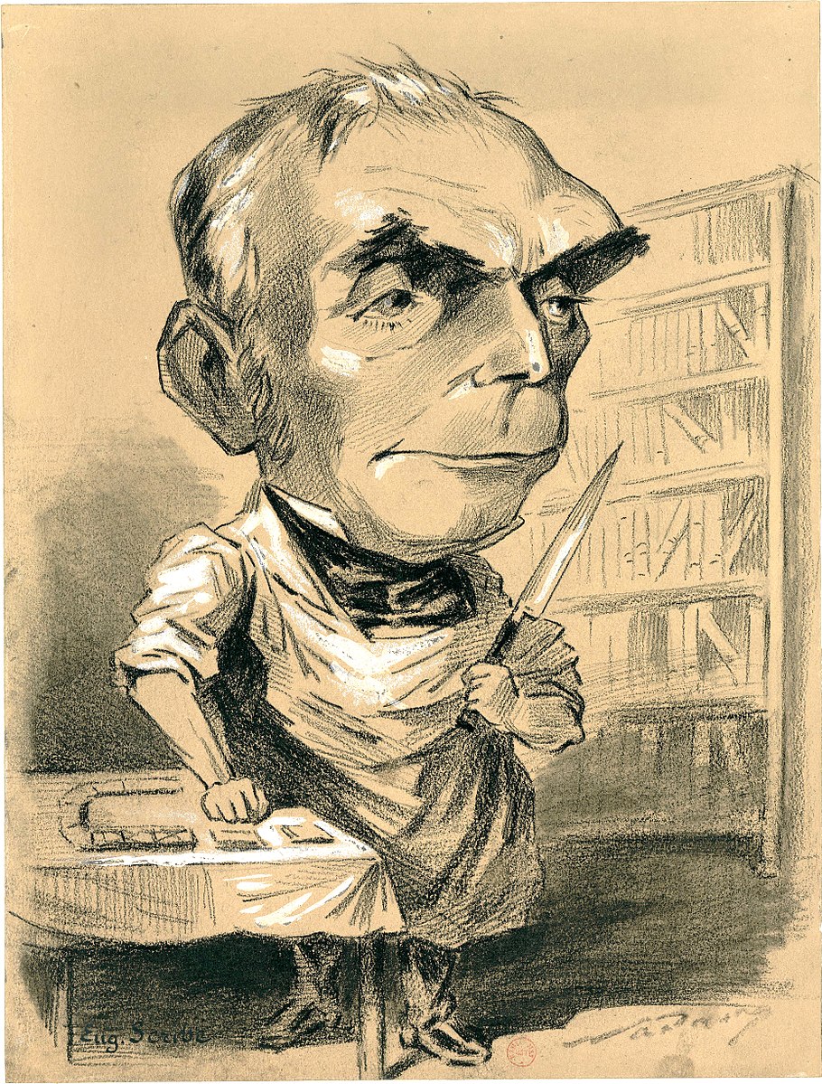 Caricature de Scribe, en pied, tenant un couteau dans la main gauche, par Nadar (entre 1855 et 1859), Paris, BnF.